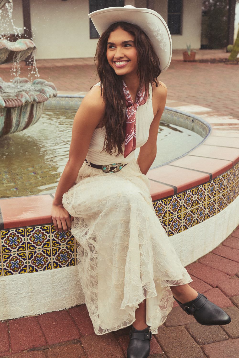 A straightforward strategy to immediately get the Westerncore aesthetic is to pair a romantic outfit with contrasting rustic-inspired Western equipment. The mushy delicate vibe of this lace skirt pairs completely imperfectly with an announcement belt, cowgirl hat, and fringed Western boots.