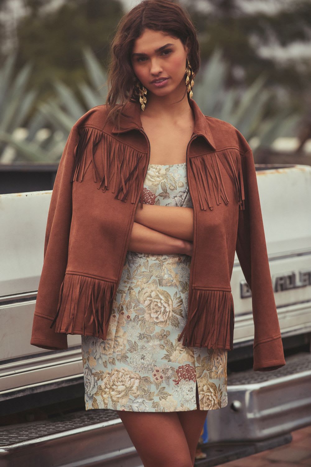 Store the Look: Fascinating Persona Gentle Blue Jacquard Bustier Mini Costume, (related) Palomino Desires Brown Fringe Coat