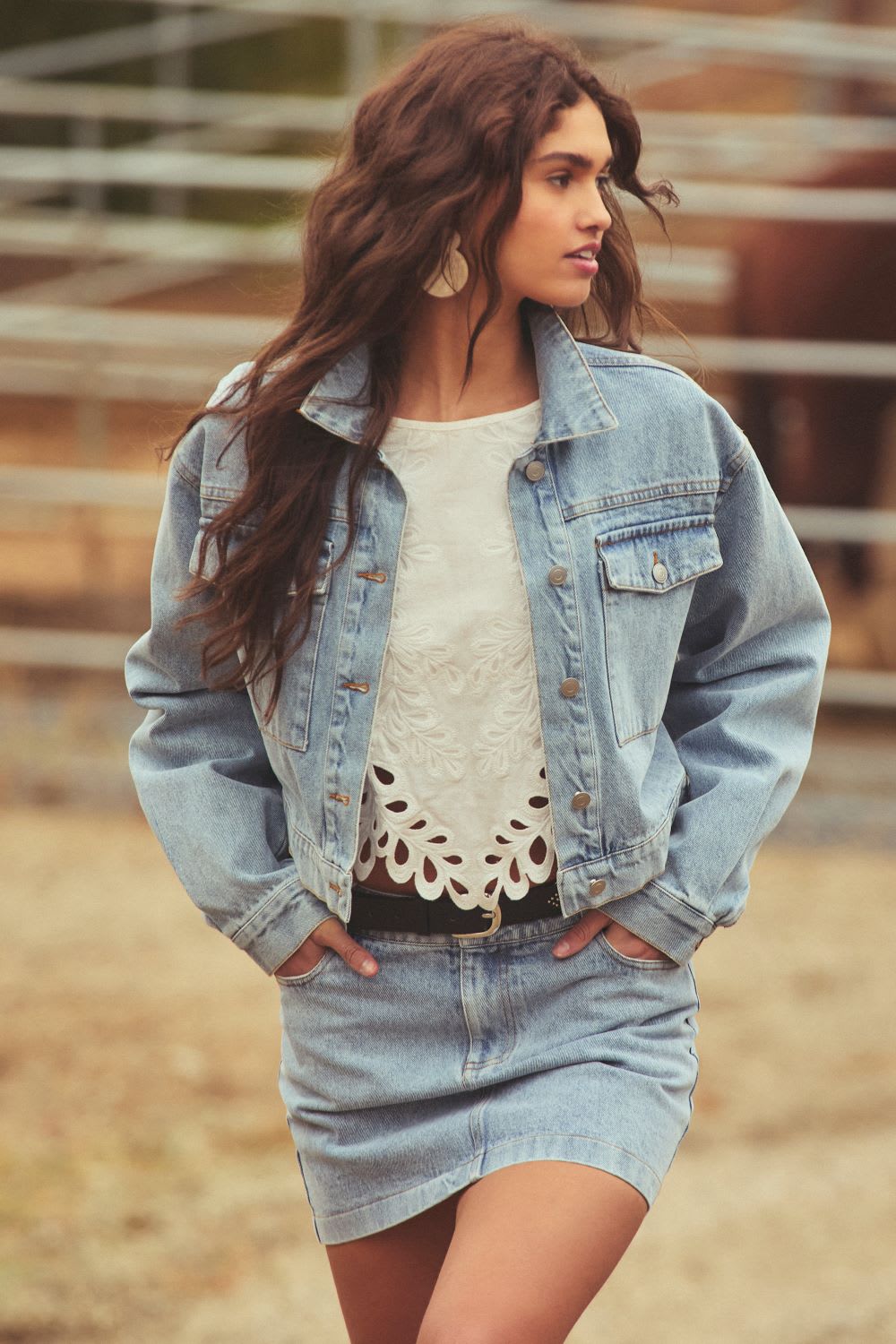 Store the Look: Adaya Gentle Wash Cropped Denim Jacket, Adjoa White Embroidered Scalloped Blouson Sleeve High, Adaya Gentle Wash Denim Excessive-Rise Micro Mini Skirt