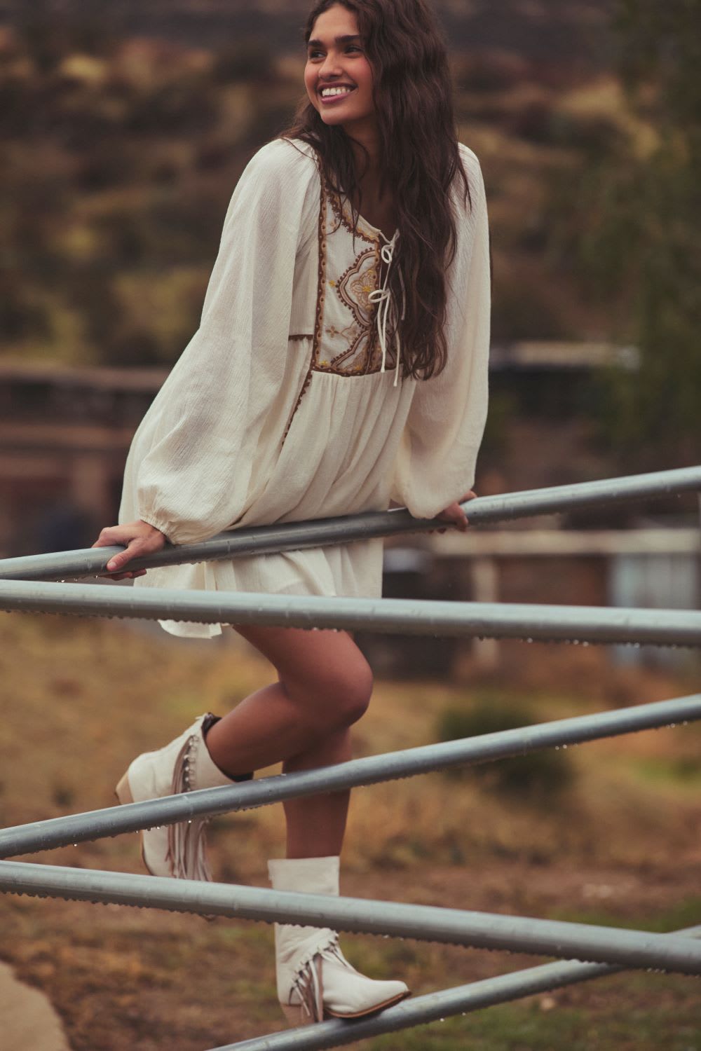Store the Look: Exceptionally Dreamy Ivory Embroidered Mini Shift Costume, Buck White Leather-based Fringe Mid-Calf Western Boots
