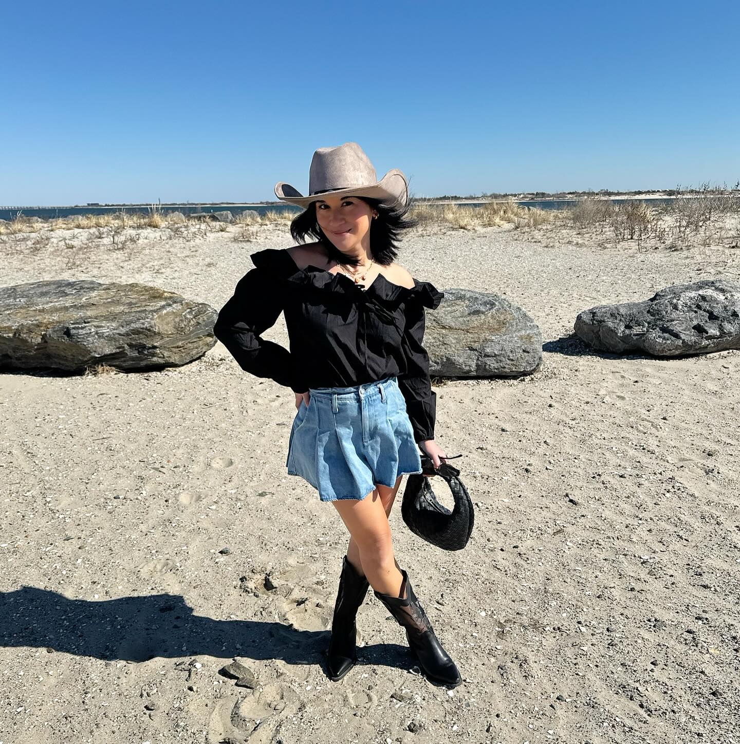 Store the Look: Dreamy Notion Black Ruffled Lengthy Sleeve Off-the-Shoulder High, Pleasant Pattern Gentle Wash Pleated Denim Mini Skirt, Mejia Black Woven Knotted Purse, (comparable)Mallerie Black Suede Studded Knee-Excessive Western Boots Picture by way of @jamie_cataldo