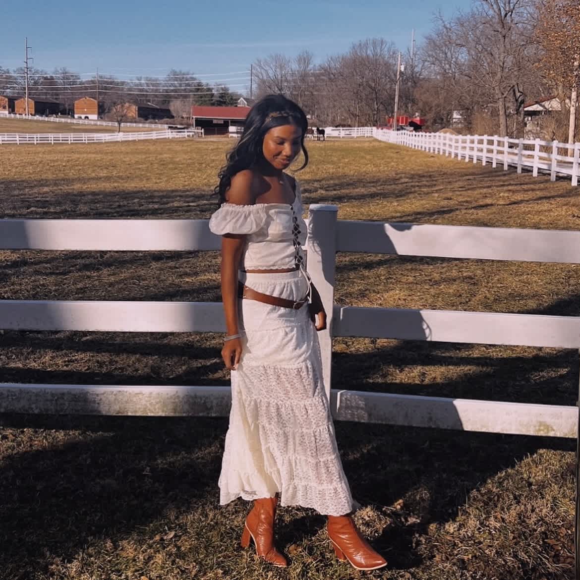Store the Look :  Huntleigh Ivory Lace Tiered Maxi Skirt, Pristine Sweetness Cream Floral Jacquard Lace-Up Crop High, (comparable) Coveted Necessity Brown Leather-based Belt; Picture by way of @mikayla.isabelle