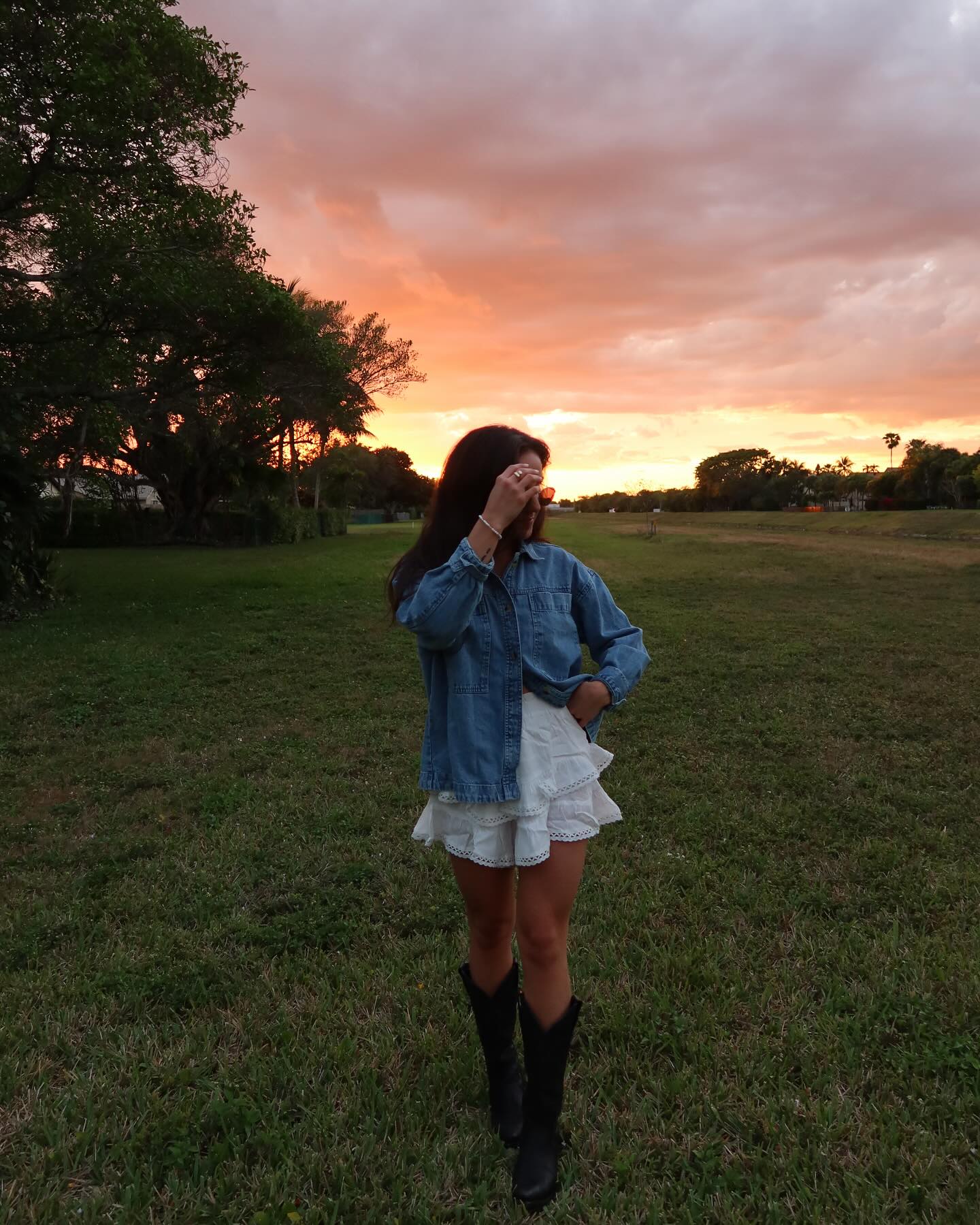 Store the Look: (comparable) Iconic Western Blue Chambray Pearl Snap Button-Up High, Pageant Flirtation Ivory Lace Ruffled Tiered Shorts, (comparable) Rauland Black Pointed-Toe Knee-Excessive Western Boots Picture by way of @thedailykasey
