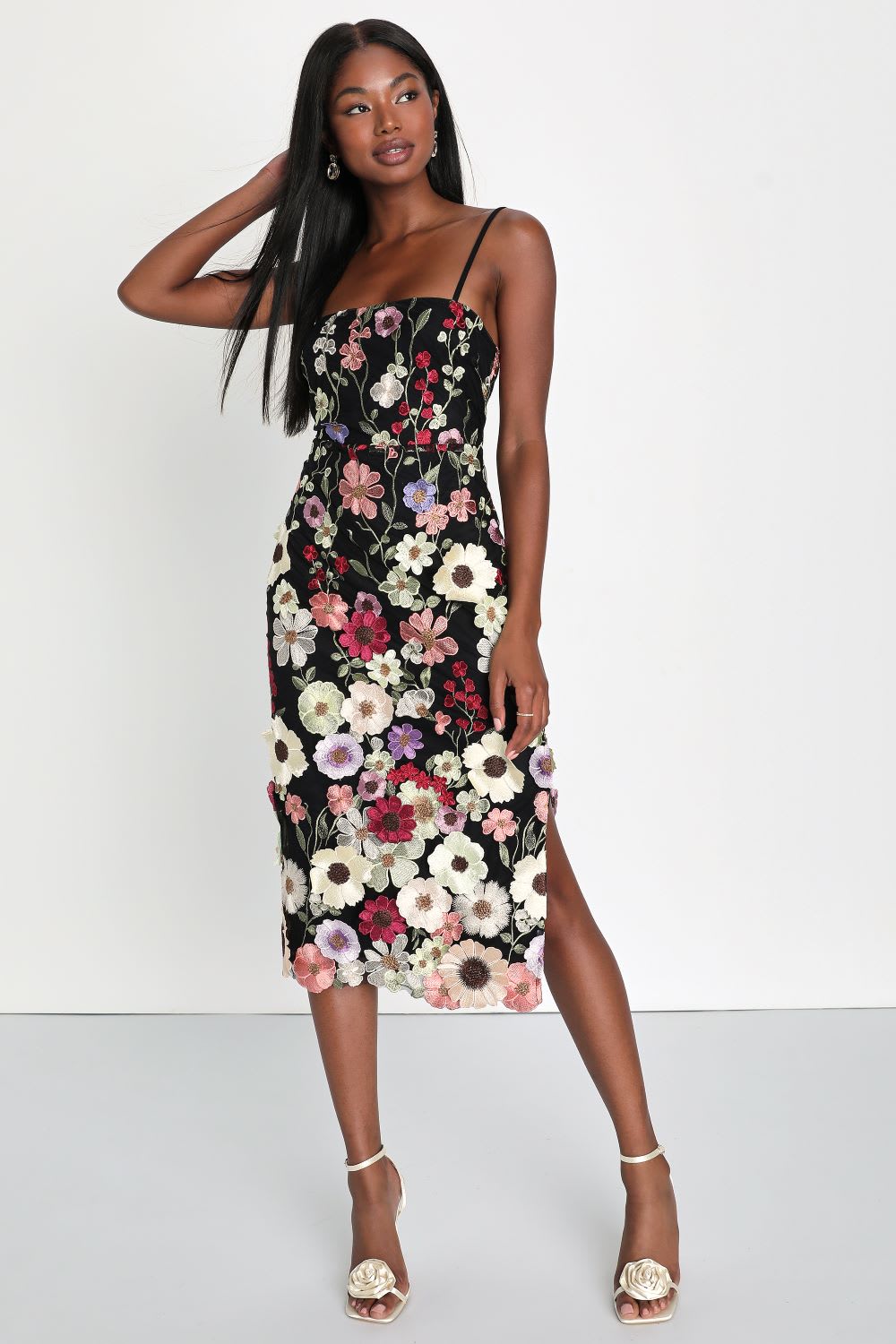 Store the Look: Thriving Vitality Black 3D Floral Embroidered Lace-Up Midi Gown