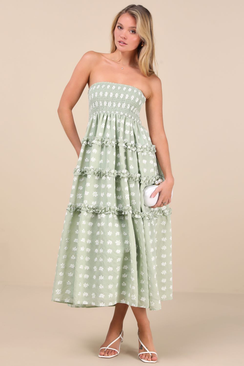 Store the Look: Lovely Sentiments Sage Floral Strapless Tiered Midi Gown