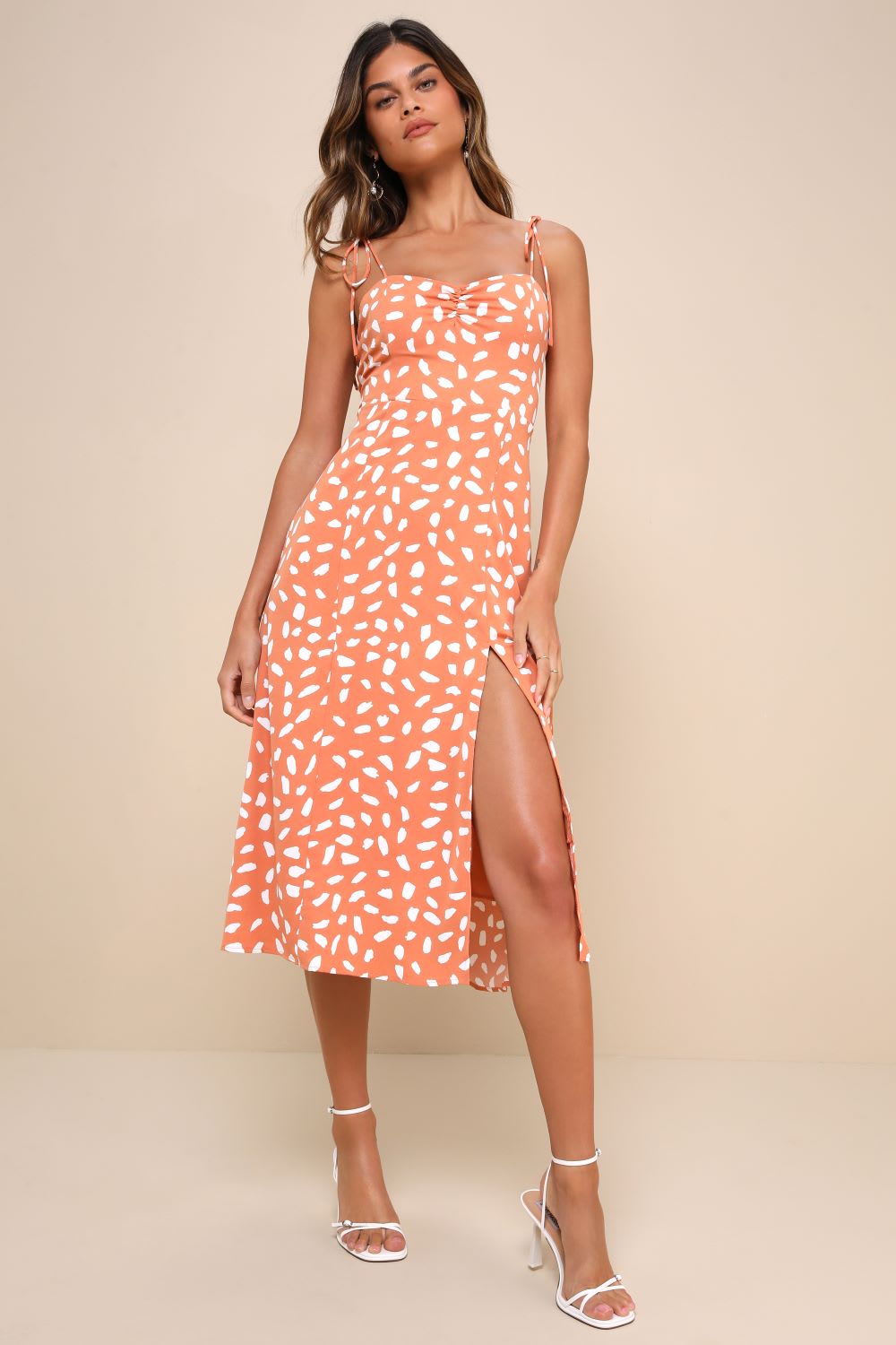Store the Look: Occasion in Paris Orange Print Tie-Strap Midi Gown