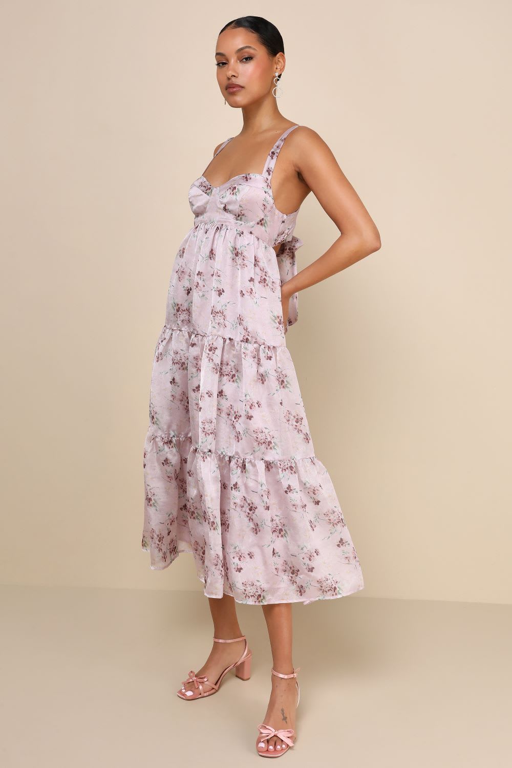 Store the Look: Marvelously Darling Mauve Floral Tiered Backless Midi Gown