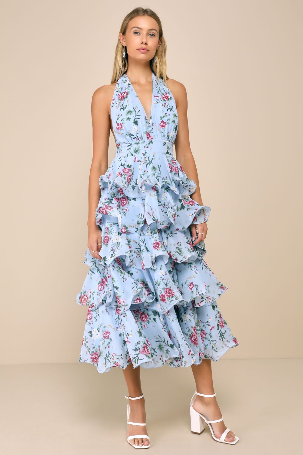Store the Look: Exceedingly Beautiful Mild Blue Floral Tiered Halter Midi Gown