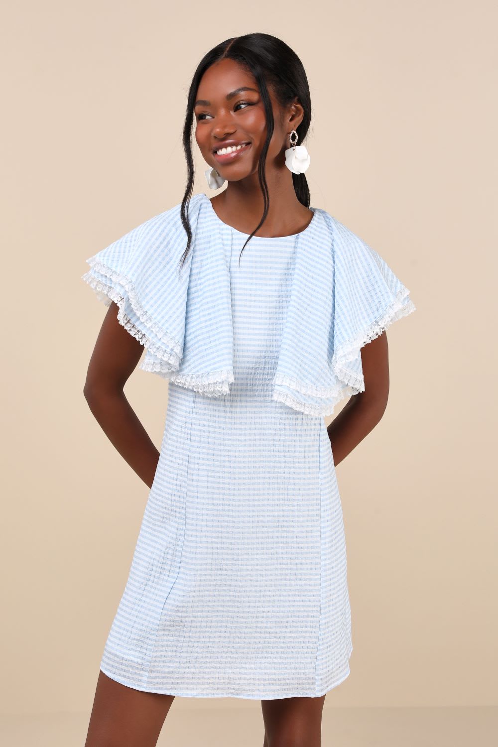 Store the Look: Nevada Blue and White Gingham Lace Flutter Sleeve Mini Gown