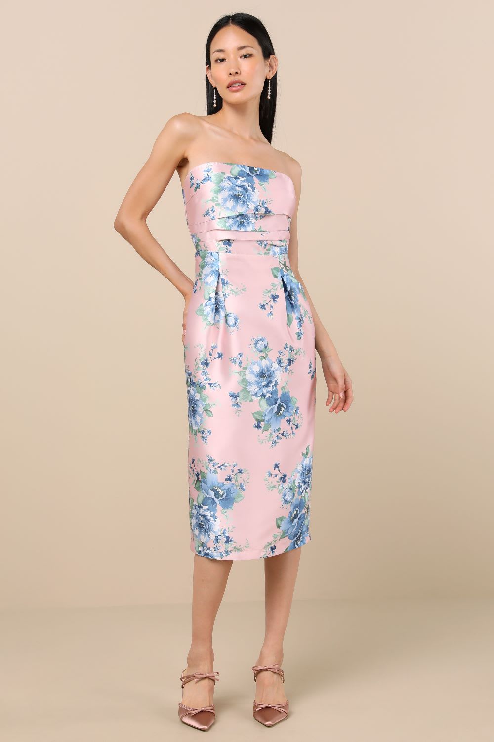 Store the Look: Kamella Mild Pink Floral Pleated Strapless Tiered Maxi Gown, Picture through @neniemn