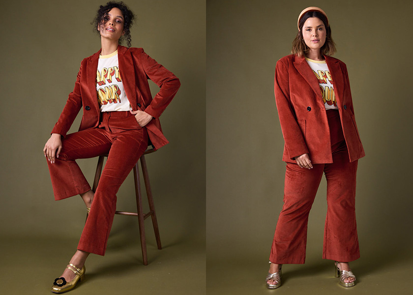 Jarvis Double Breasted Corduroy Blazer, Camillo Completely happy Hour Slogan Tee, Richmond Corduroy Flared Trousers, Good Metallic Leather-based Mary Jane Sneakers, Montpellier Metallic Leather-based Platform Sandals