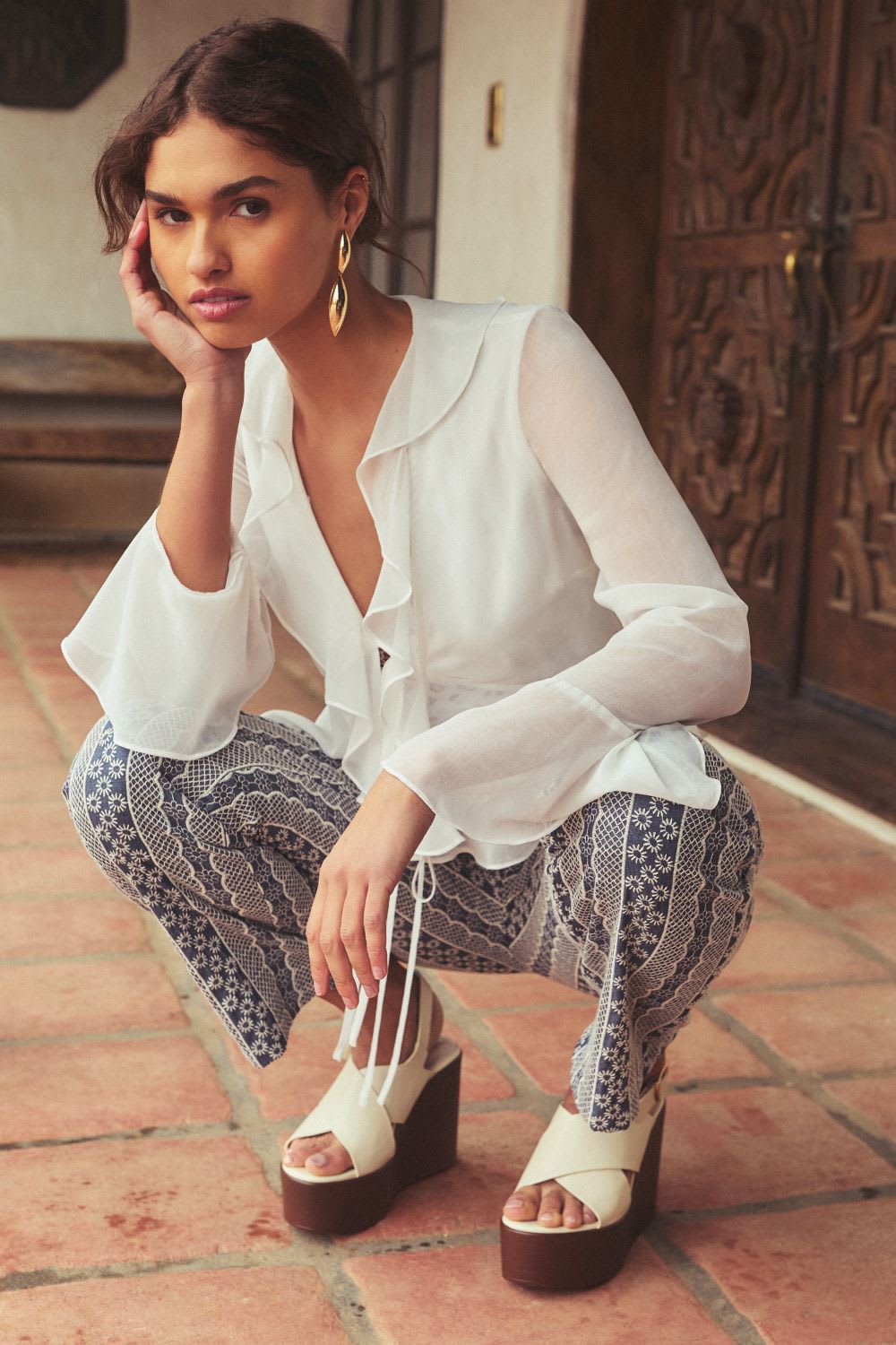 Store the Look: Thriving Flirt White Chiffon Ruffled Lengthy Sleeve Tie-Entrance Prime
