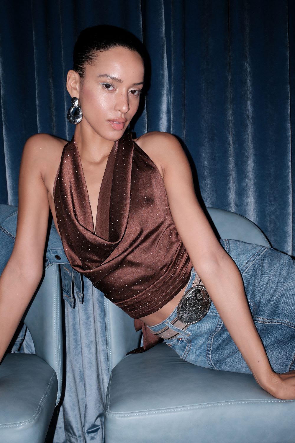 Store the Look: Notable Shine Brown Satin Rhinestone Halter Prime