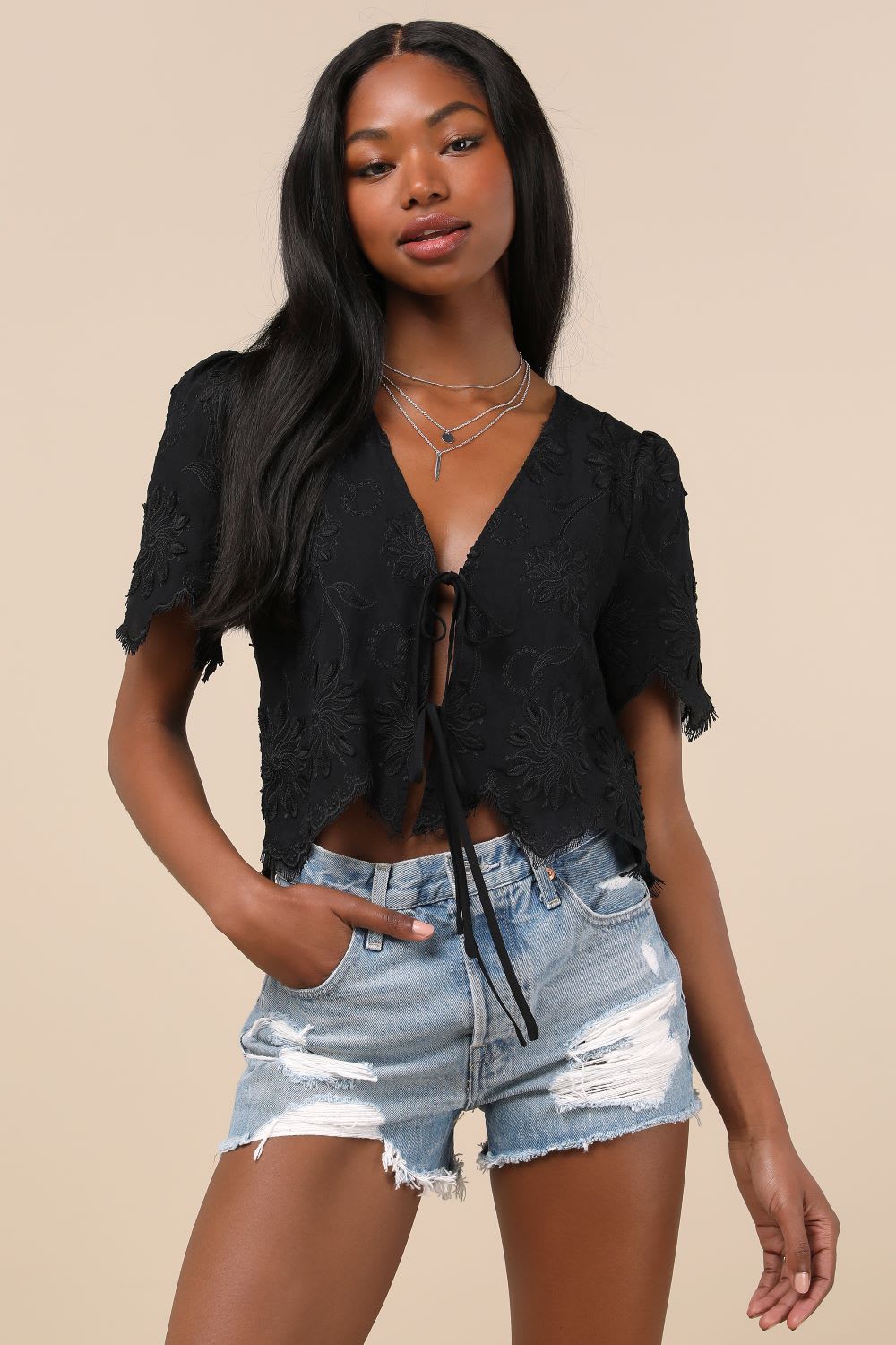 Store the Look : Classic Aesthetic Black Embroidered Tie-Entrance Fringe Hem Prime