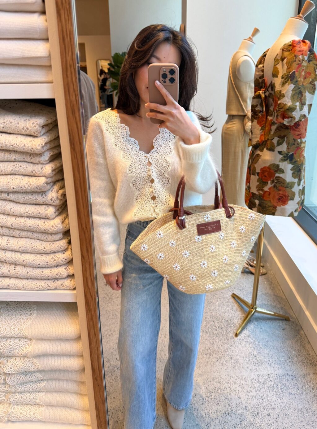 I wore this cardigan to the shop and it’s one of the petite-friendly items from Sézane I’ve ever discovered! As somebody who nearly all the time has to fold or cuff up my sleeves, I used to be thrilled that even the sleeve size labored nicely on me. The general high is a extra slim and shrunken match cropped model, and is a 100% natural cotton lace crochet-like knit. I really like how nicely it pairs with my excessive waisted denims and pants. You may put on a pores and skin toned bra or tank high like this beneath for extra protection.