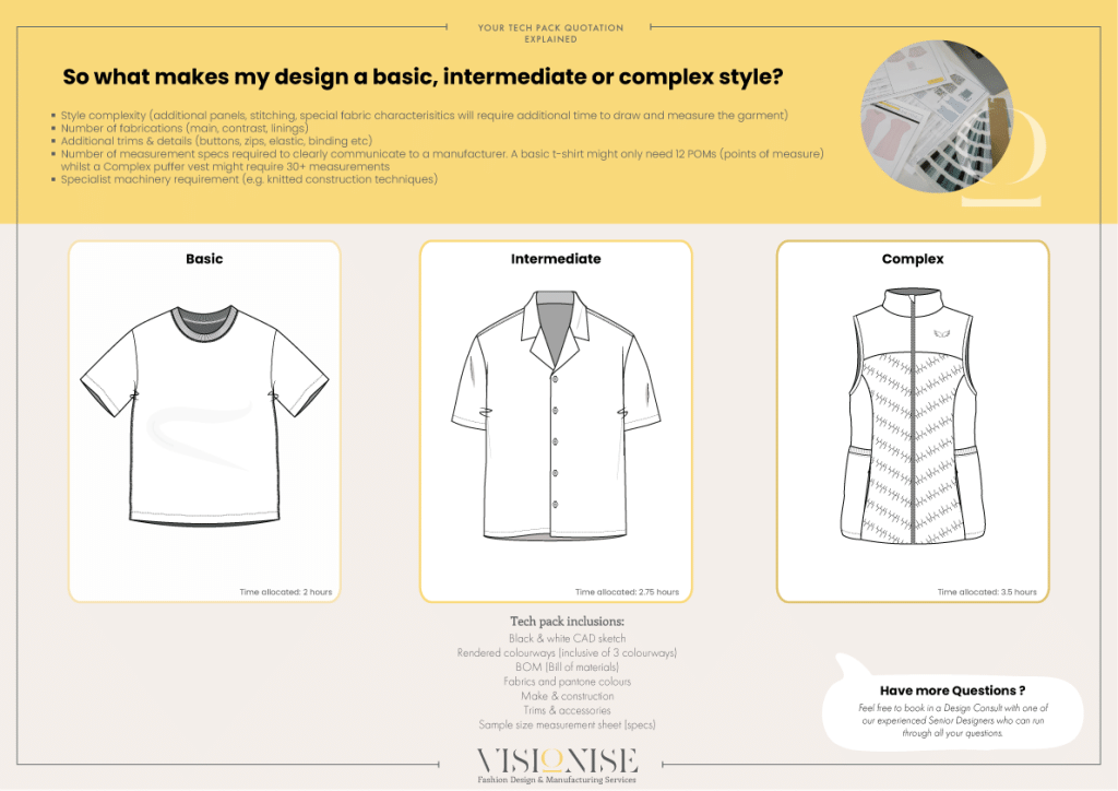 WITH TECK PACKS YOU CAN REQUEST PRODUCTION PRICES FROM CLOTHING MANUFACTURERS TO BE CALCULATED BEFORE INVESTING IN PHYSICAL SAMPLES