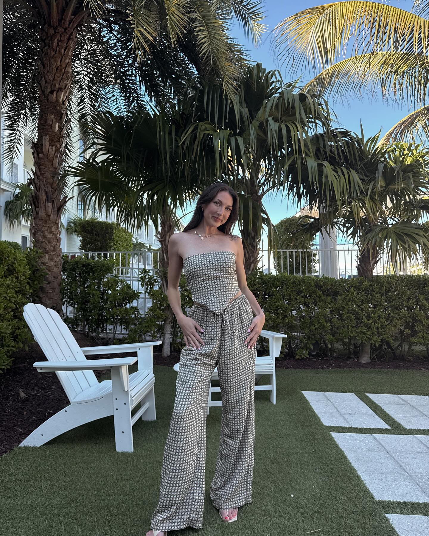 Store the Look: Hit the Breeze Beige Smocked Vast-Leg Pants, Easy Mentality White Pleated Strapless Prime ; Picture through @xoblondevoyage2