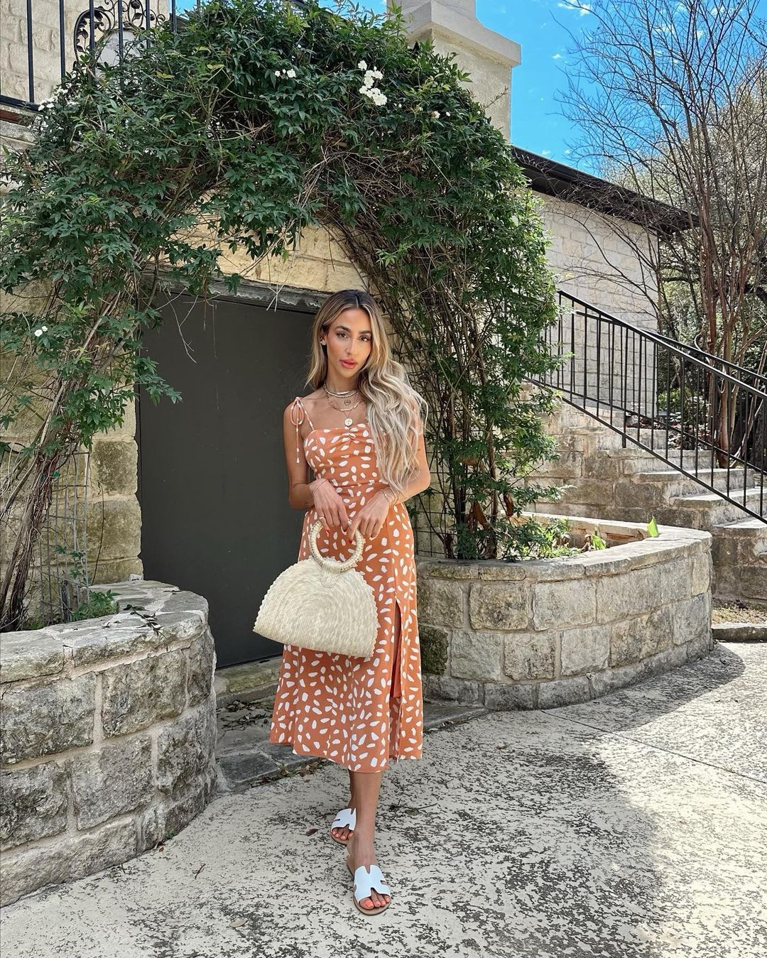 Store the Look: Occasion in Paris Mild Orange Print Tie-Strap Midi Gown, Resort Sure Beige Woven Straw Tote Bag; Picture Through: @Courtney_Shields